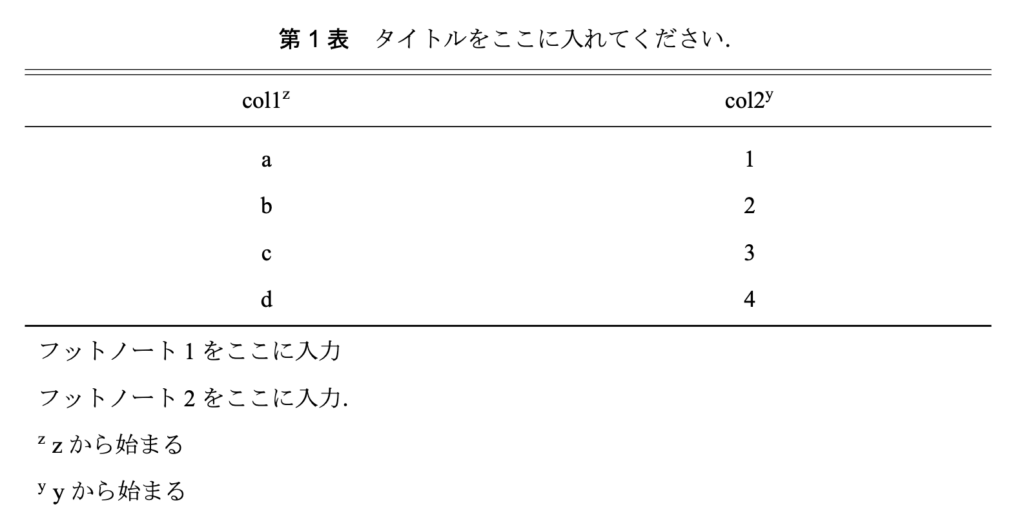 R Markdownで表を作成するときに便利なのが、kableとkableExtraパッケージです。これらを使うと、見やすい表にフットノートを簡単に追加できます。